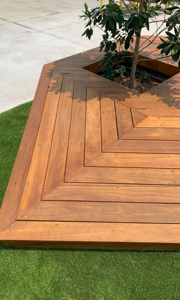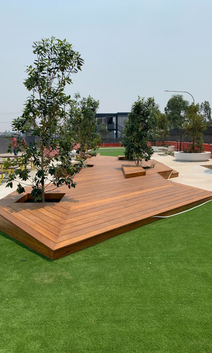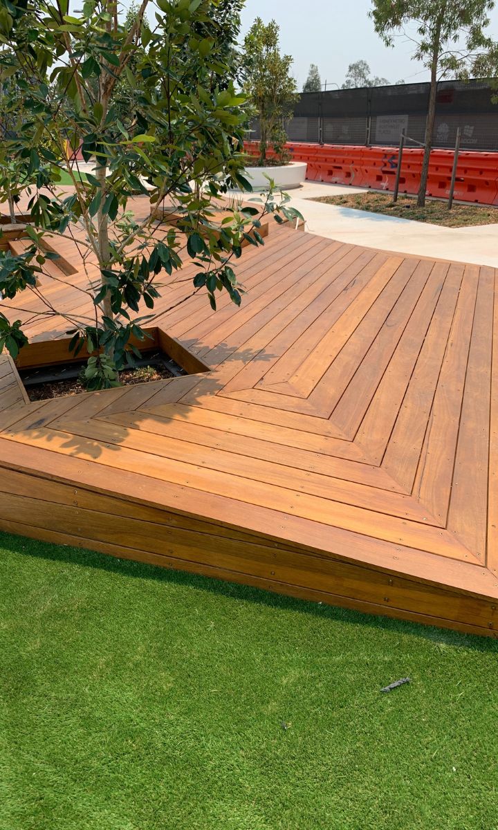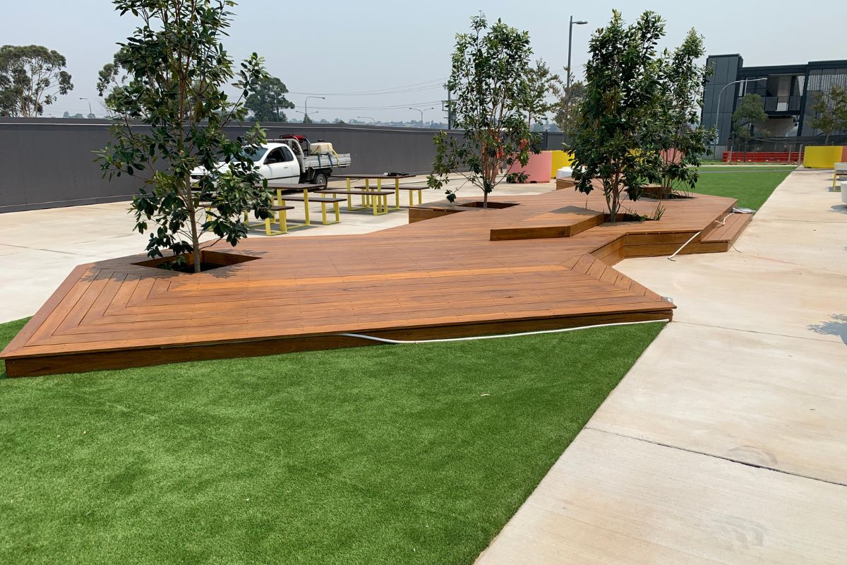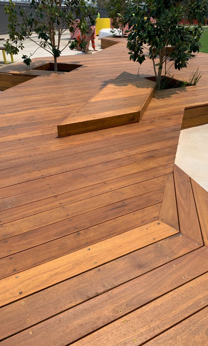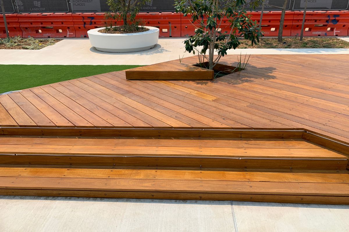 The design focused on creating an inviting outdoor space that would feel both practical and welcoming for the thousands of passengers moving through the station each day. Built with a treated pine frame for long-lasting structural strength, the deck was finished with top-fix hardwood decking boards to achieve a natural, timeless look while withstanding the demands of a high-traffic public area.