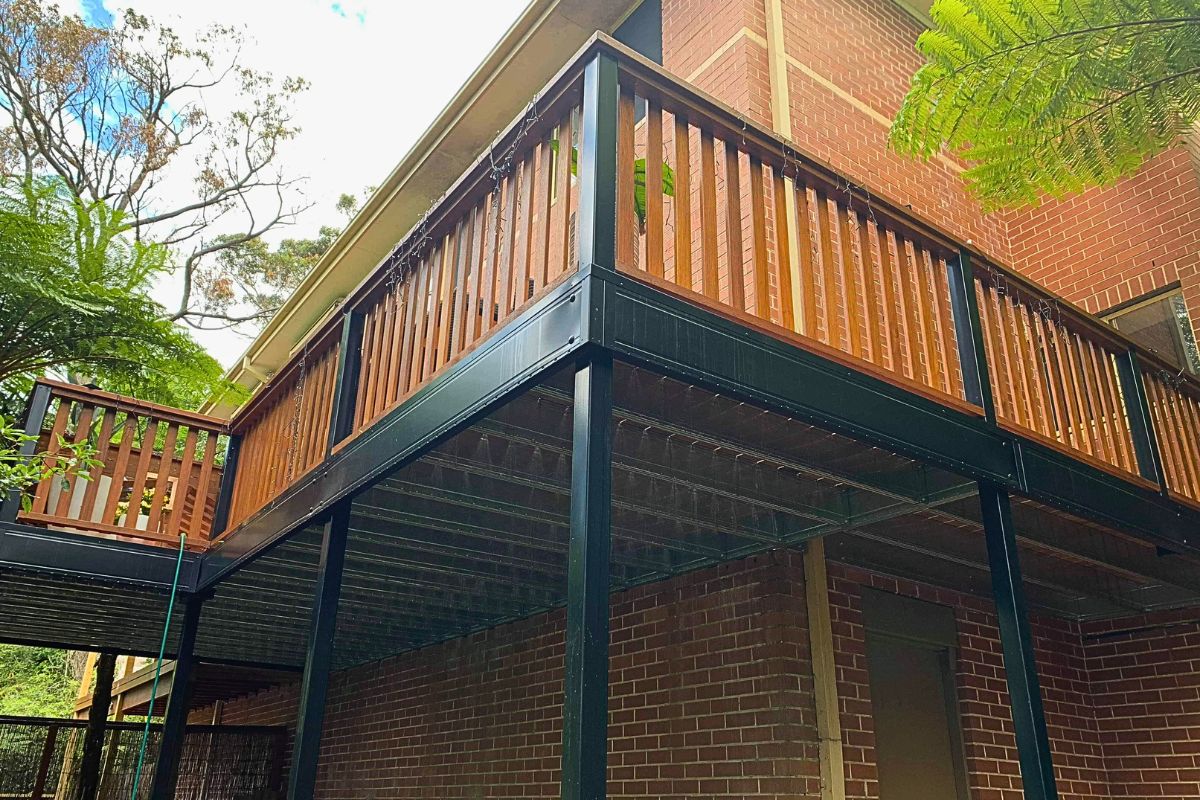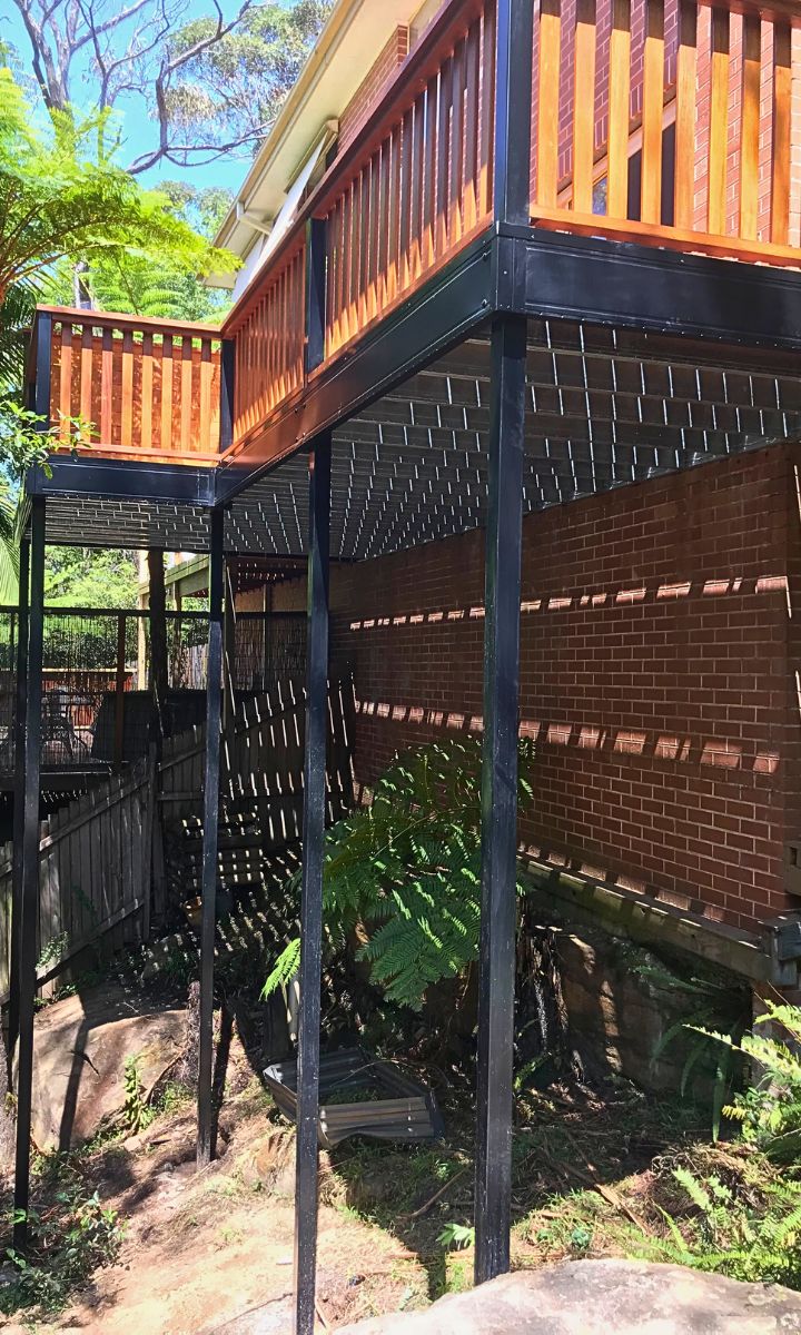 Our custom designed and built elevated steel framed hardwood deck has given our client better use of their steep slopping backyard. We were surprised to come across a Sydney Water mains pipe that was incorrectly positioned on Sydney Water’s planning report. Fortunately, our quick thinking team came up with an alternative construction plan in conjunction with our Certifying Authority for the deck without interruption to the build timeline or compromising the design.