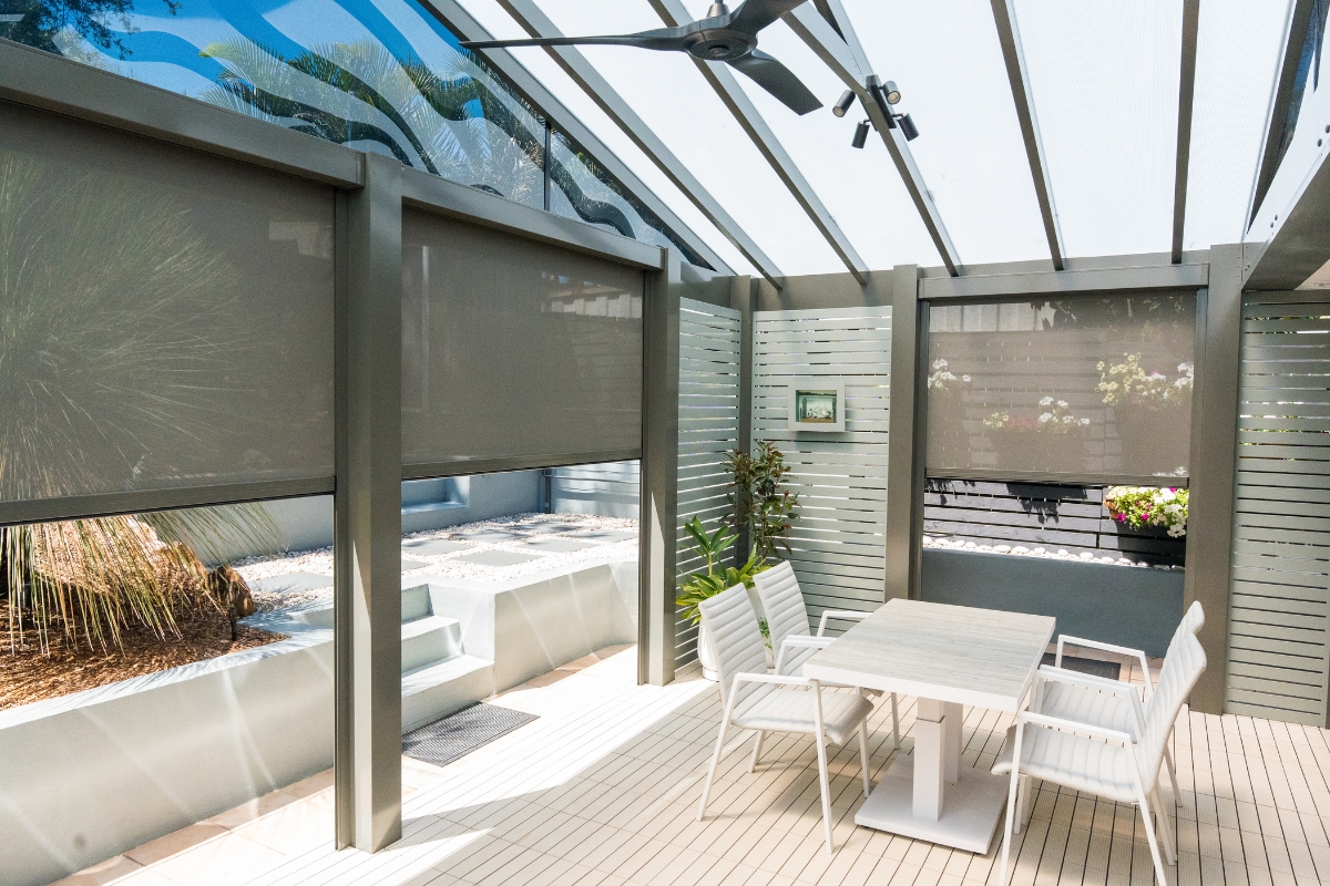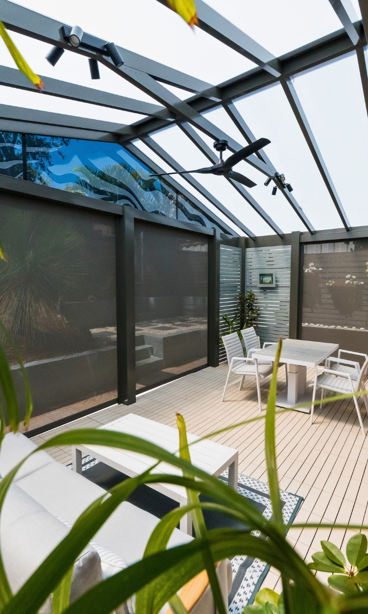 Privacy was a key part of the brief. Fixed screening and automated E-Blinds help create a secluded courtyard feel, while also offering flexibility against sun, wind and rain. The result is an outdoor room that feels open and airy, yet calm and protected.