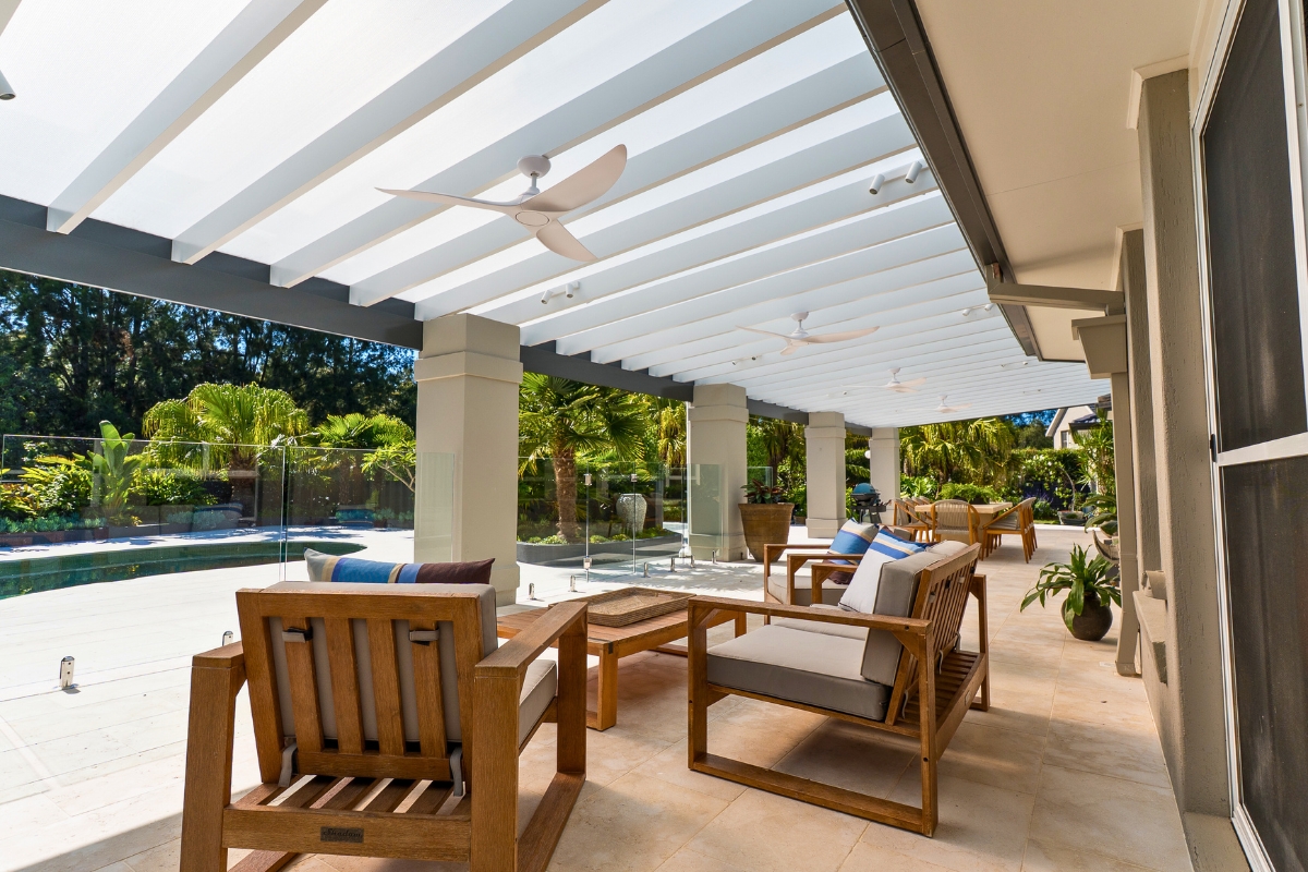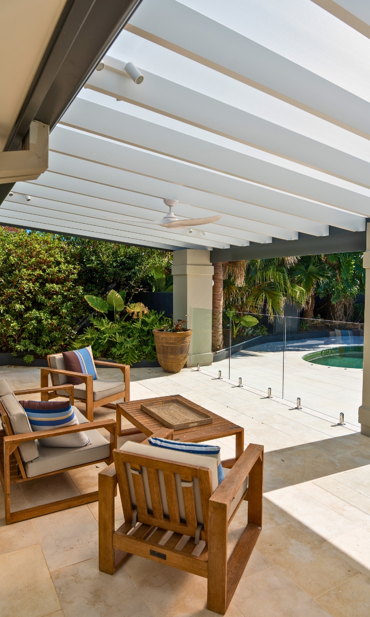 The original pergola had become outdated and visually heavy, with dark metal roof sheets and oversized rafters that made the poolside space feel enclosed and dated. The brief was to create a more refined architectural feature that would complement the home while opening the area to light and outdoor living.